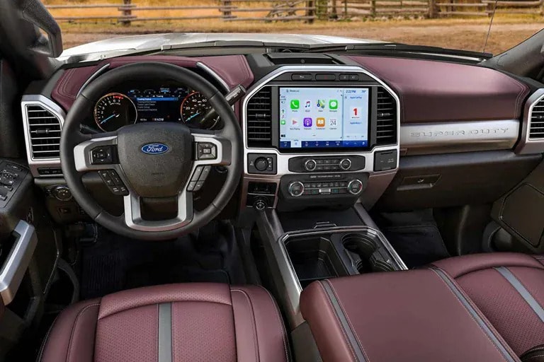 Super Duty® Platinum models are outfitted with the Dark Marsala interior, which includes luxurious features such as ambient lighting, multicountour seats, Platinum Brushed, Dark Storm Metallic and Onyx Argento appliqués throughout the cabin and micro-perforated leather seats with Silver Smoke Metallic accents with unique Platinum badging.