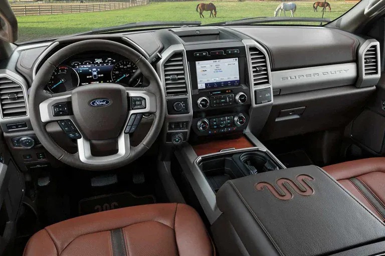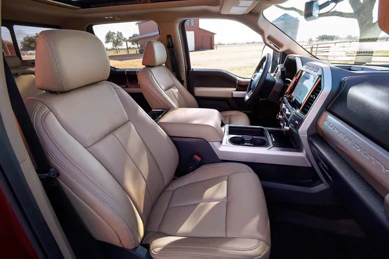 Super Duty® LARIAT models feature an updated color scheme for 2022. The all-new LARIAT Baja interior includes enhanced micro-perforated leather seats, as well as tarnished metal appliqués throughout the cabin.