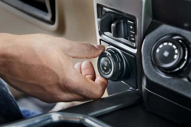 Trailer Reverse Guidance* — Digitally expanded view via cameras in the sideview mirrors and visual guides in the center dash screen show the direction of the truck and the trailer, with guidelines changing with steering wheel movement. Pro Trailer Backup Assist™* — Rotate an instrument panel knob left or right where you want the trailer to go while the system controls steering.
